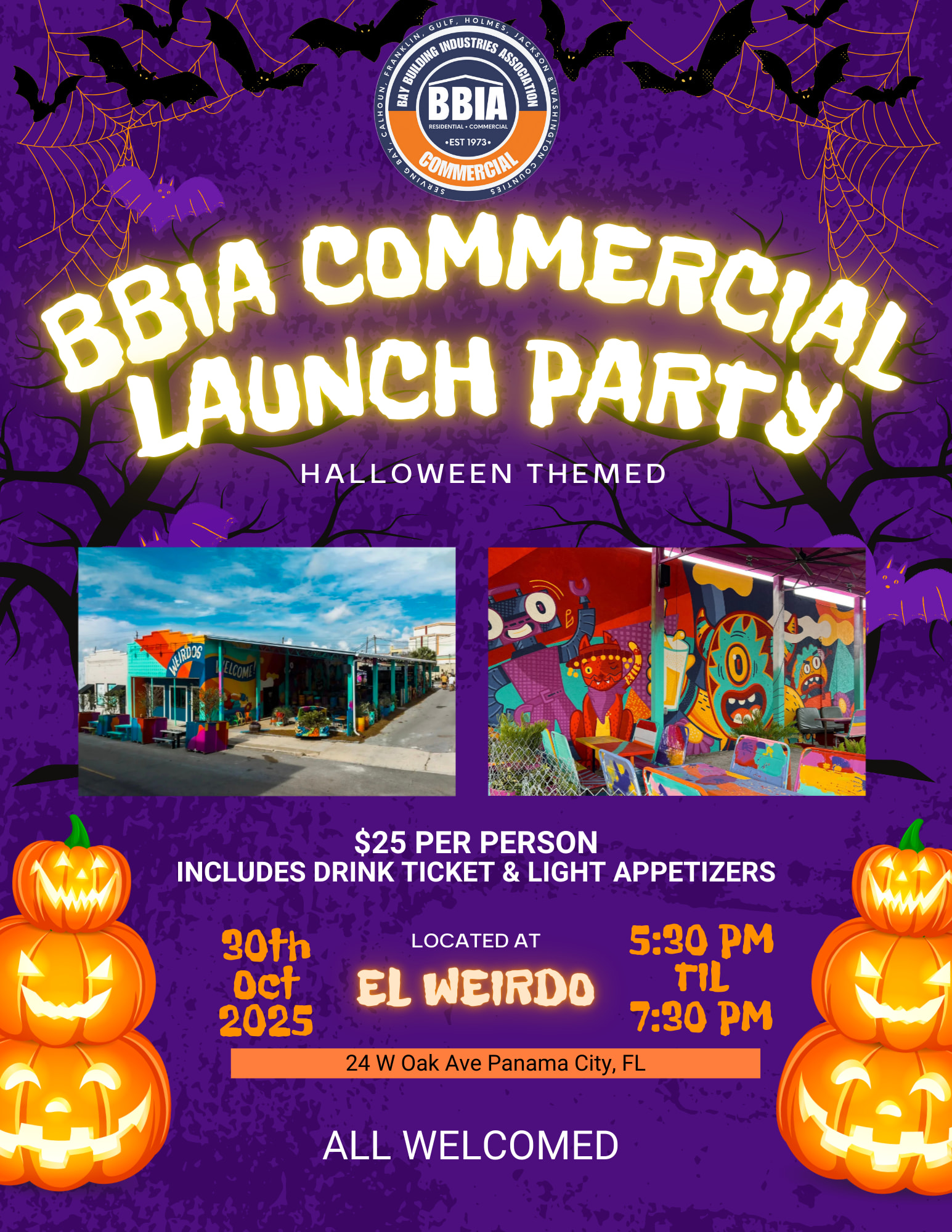 The Bay Building Industries Association (BBIA) is excited to kick off our Commercial Division with a fun and festive Halloween Launch Party! Join us for an evening of networking, celebration, and community spirit at one of downtown Panama City’s most vibrant spots – El Weirdo.
