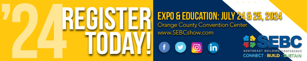 The 2024 Southeast Building Conference (SEBC), scheduled for July 24 – 25, 2024 in Orlando, FL. Programming will include two days of hard-hitting education, the region’s largest building industry trade show, networking opportunities and more!